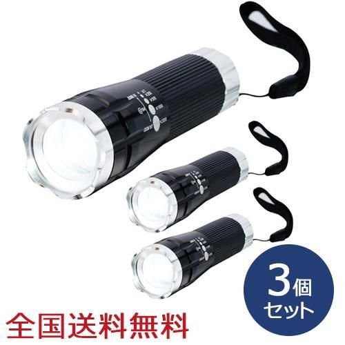 ツイストズーム付き3W LEDトーチ ハンディライト 防災 アウトドア 懐中電灯 シルバー&ブラック お得な3個セット