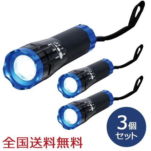 ツイストズーム付き3W LEDトーチ ハンディライト 防災 アウトドア 懐中電灯 ブルー&ブラック お得な3個セット