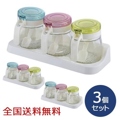 ガラス製カラフル調味料カップ 3P(スプーン付き) 調味料入れ 保存容器 お得な3個セット