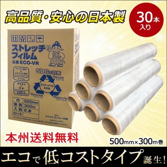 ストレッチフィルム VR 500mm×300m巻 日本製 6巻(6本)入 5箱セット 合計30巻 13μ(13ミクロン)相当品 エコ仕様 本州送料無料